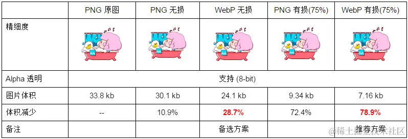 转换后的 WebP 支持 Alpha 透明和 24-bit 颜色数,不存在 PNG8 色彩不够丰富和在浏览器中可能会出现毛边的问题