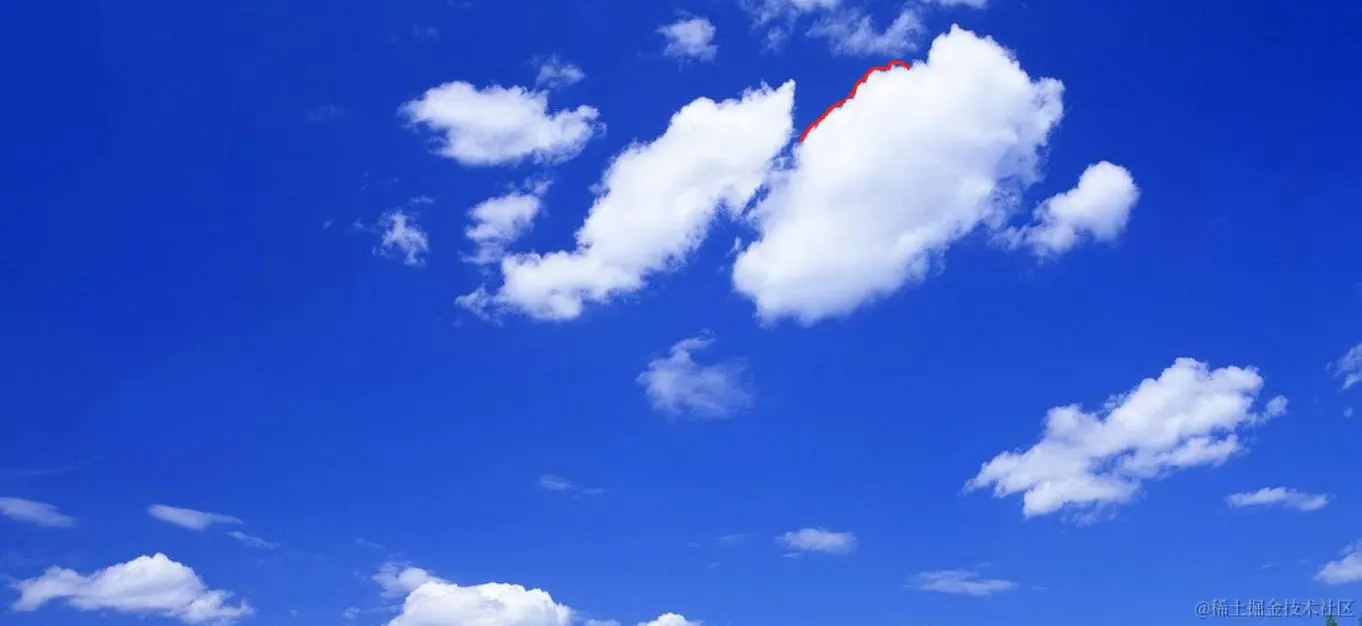 例如蓝色天空背景上的一朵白云,有损压缩时会删除白云与蓝天交界的部分,即图中红线所在位置。