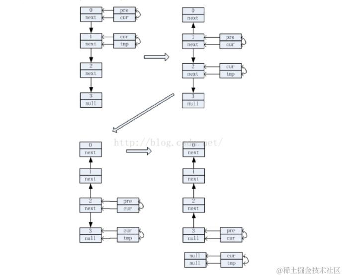 基本思路是:将当前节点cur的下一个节点 cur.getNext()缓存到temp后,然后更改当前节点指针指向上一结点pre。也就是说在反转当前结点指针指向前,先把当前结点的指针域用tmp临时保存,以便下一次使用,其过程可表示如下: