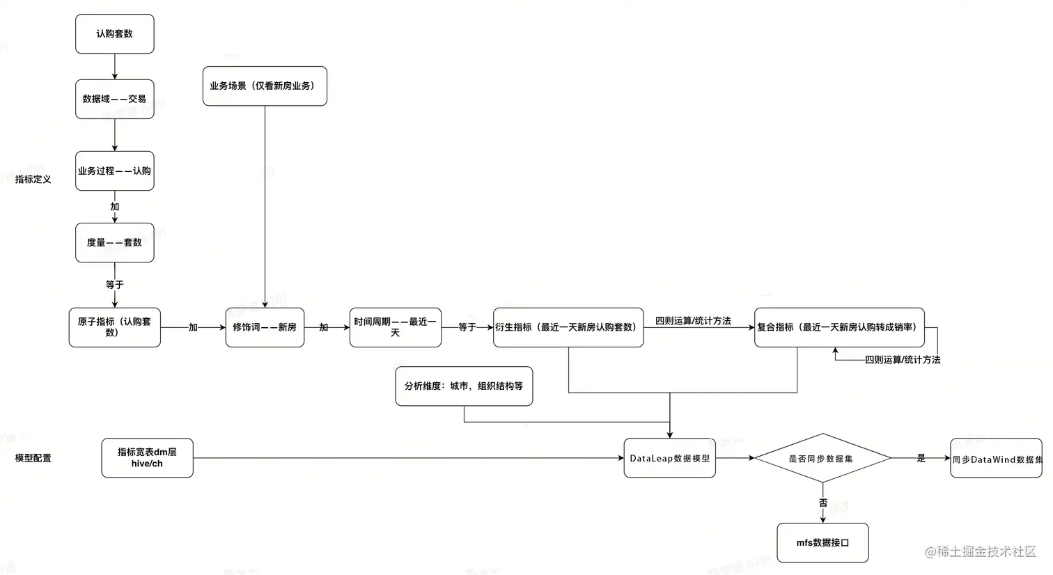 指标拆解完成后,对原子指标、衍生指标和复合指标进行创建和技术口径维护,结合需求创建数据模型打通 DataWind 数据集和 mfs 数据服务。