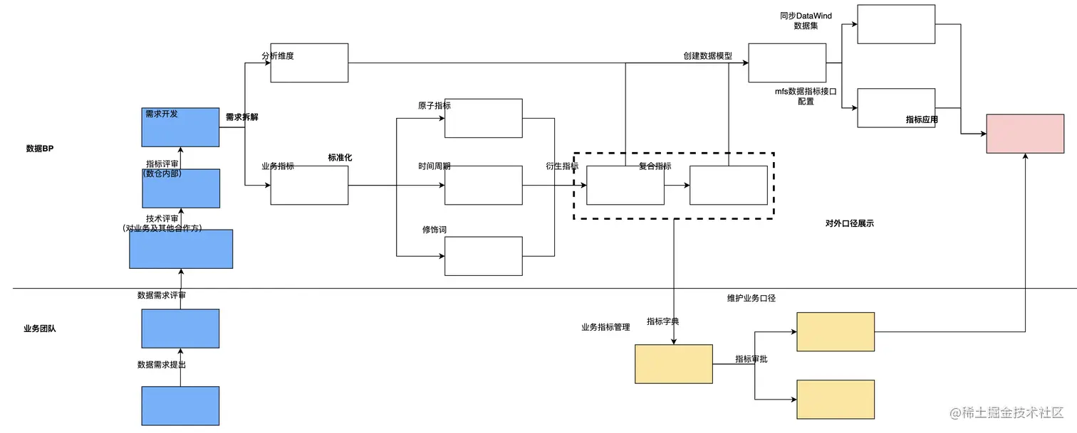 数据 BP 需要进行业务指标和分析维度的拆分,对于指标需先考虑指标字典中是否存在(防止重复开发),如果不存在, 需要拆解为原子指标+时间周期+修饰词, 并落入到指标平台;根据实际应用场景采用 DataWind 数据集或数据接口输出指标。