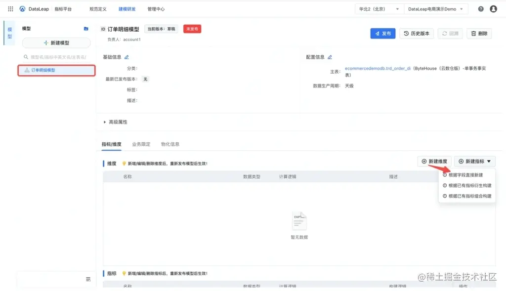 通过 DataLeap 指标平台,幸福里数据团队完成交易平台新房方向 p0 指标 100%覆盖,包括指标定义、模型配置、责任人等元信息维护。