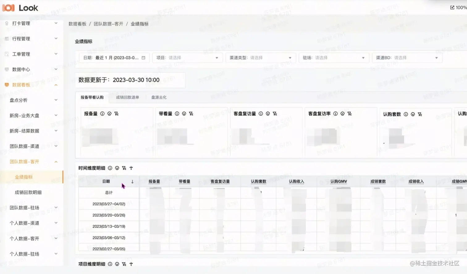 - LOOK 是幸福里内部效率管理系统,除作业功能模块外,销售人员作业数据分析也是 LOOK 重要功能,通过数据及时监控内部员工作业效率,反馈核心大盘数据。该系统下新房数据整体通过 DataLeap 同步 DataWind 数据集方式提供数据服务。
