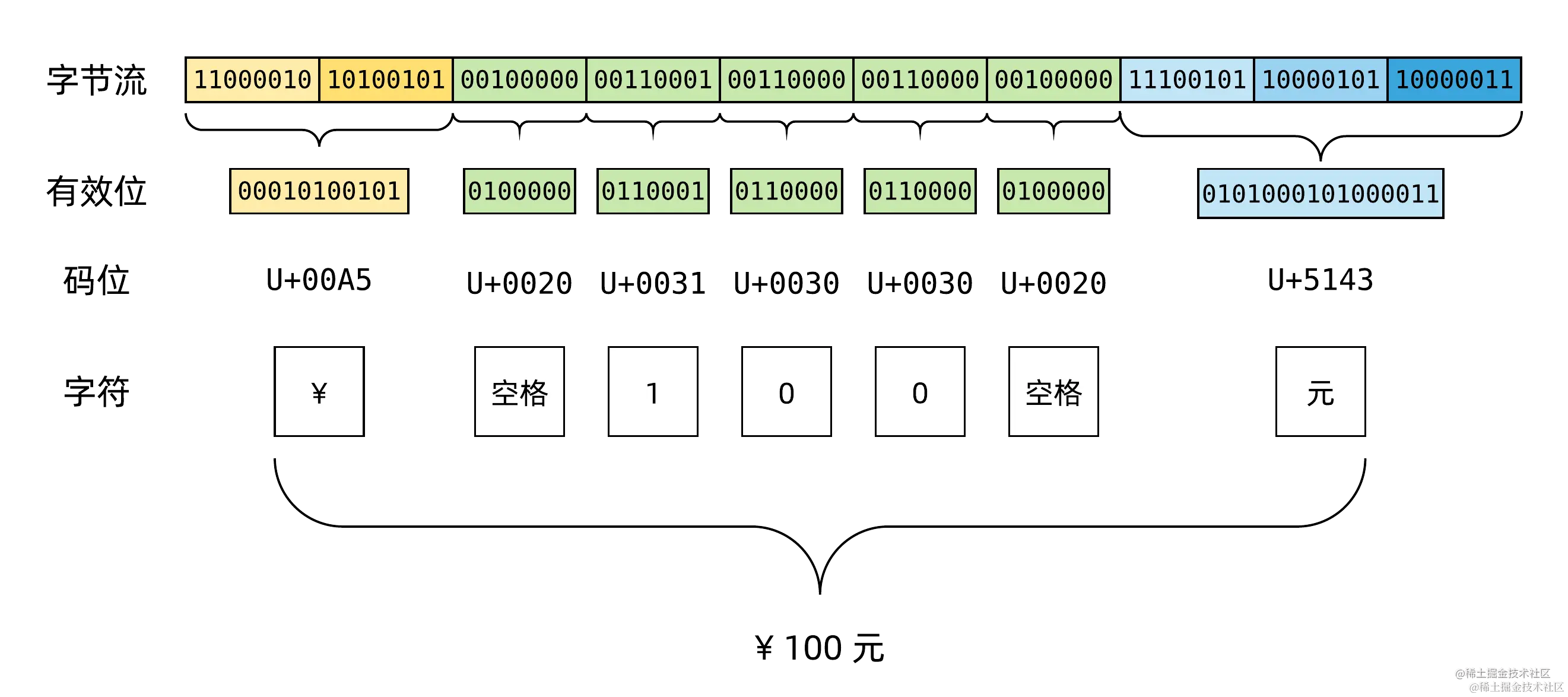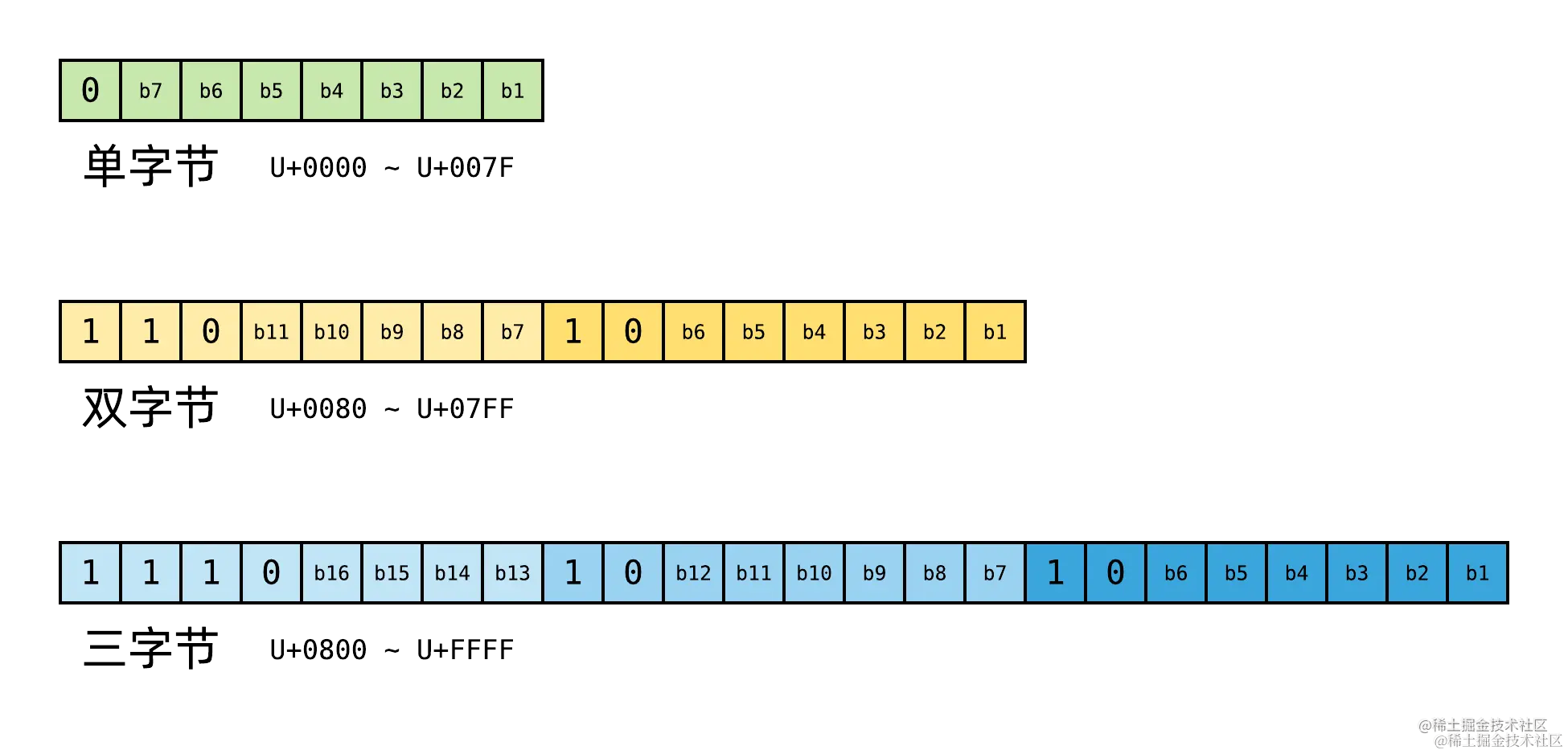 如图,以 0 开头的字节为 单字节 编码,总共 7 个有效编码位,编码范围为 U+0000 至 U+007F ,刚好对应 ASCII 码所有字符。以 110 开头的字节为 双字节 编码,总共 11 个有效编码位,最大值是 0x7FF ,因此编码范围为 U+0080 至 U+07FF ;以 1110 开头的字节为 三字节 编码,总共 16 个有效编码位,最大值是 0xFFFF 因此编码范围为 U+0800 至 U+FFFF 。