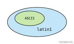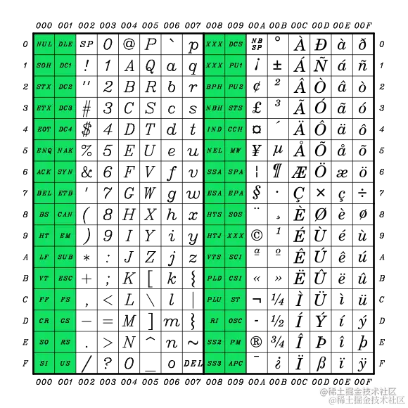 图中绿色部分是不可打印的( unprintable )控制字符,左半部分是 ASCII 码。因此,latin1 字符集是 ASCII 码的超集: