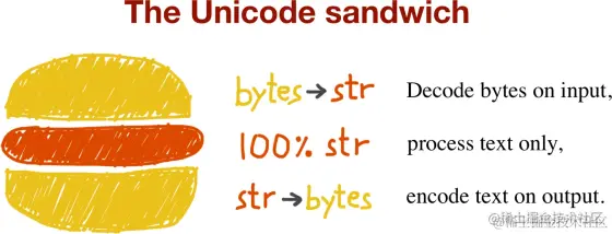 举个例子,Python 从 3 以后, str 就是 Unicode 字符串了,而 bytes 则是 字节序列 。因此,在 Python 3 程序中,核心逻辑应该统一用 str 类型,避免使用 bytes 。文本编码、解码操作则统一在程序的输入、输出层中进行。