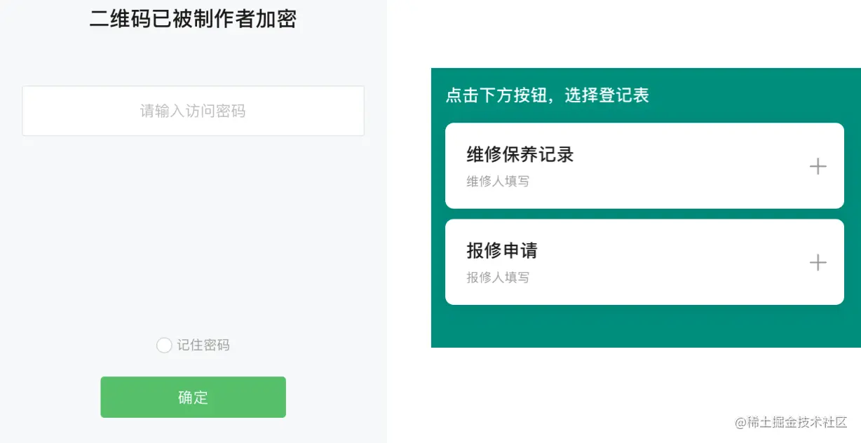 在二维码识别技术和对应数据传输性能的加持下,只需拿起手机用微信扫描设备上的二维码,便可直观查看到该设备的相关信息和操作流程,同时还可根据实际需求点击维保记录表单或报修申请表单的填写按钮,根据指示完成线上维保、报修操作。
