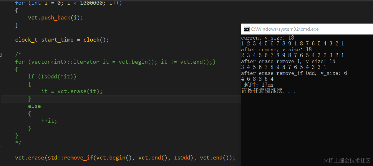 由此可见,对大数据量的操作,用 vct.erase(std::remove_if(vct.begin(), vct.end(), IsOdd), vct.end()) 比直接用erase,效率提升非常大,算法整体复杂度低。