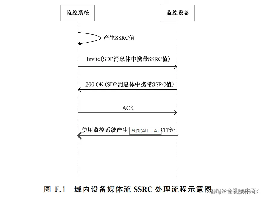 点播域内设备媒体流时,SSRC值由本域监控系统产生并通过Invite请求发送给设备使用,设备在回复的200 OK消息中携带此值,设备在发送的媒体流中使用此值作为RTP的SSRC值。流程图见图 F.1。