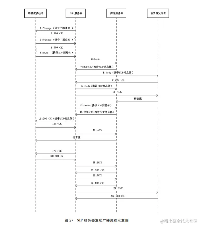 w)23:SIP服务器向语音流发送者发送 BYE 消息,断开消息8、9、11建立的同语音流发送者的 Invite会话。