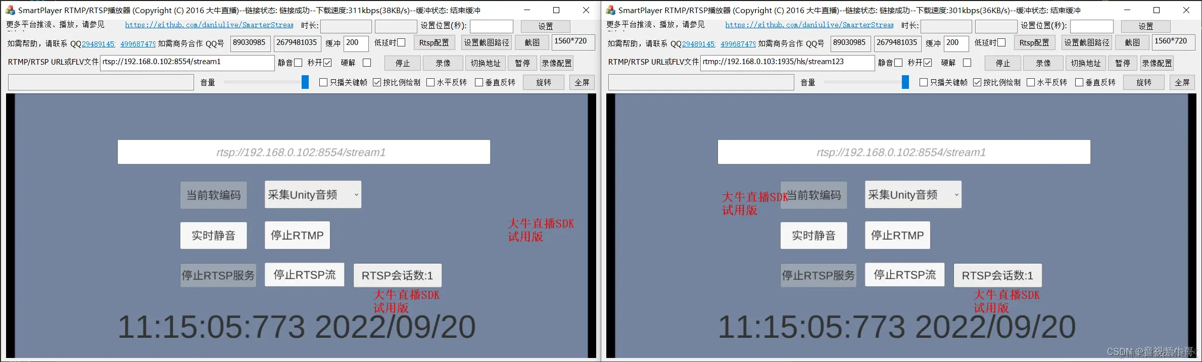 好多开发者在做虚拟仿真、VR教育等场景的时候,遇到个问题,想把头显里面的画面在内网环境下低延迟的同步出来,又不想单独部署流媒体服务器。为此,我们在Unity下,添加了轻量级RTSP服务模块,通过头显端启动个轻量级RTSP服务,把采集到的音视频数据,通过对外提供RTSP拉流URL的形式,供内网其他终端调用,废话不多说,先上图看效果: