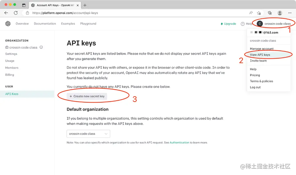调用ChatGPT的接口需要先申请一个API key,登录账号之后,点击页面右上角的用户名,选择【View API keys】,在弹出的页面上点击【Create new secret key】,创建一个新的API key。请注意,API key生成成功后需要复制下来并妥善保存,在页面上无法再次查看,后面在代码中调用时会用到。
