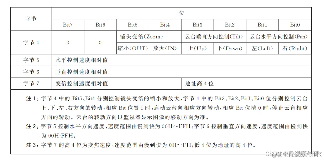 PTZ指令我们之前有提到过,如下图所示,Bit5和 Bit4不应同时为1,Bit3和 Bit2不应同时为1;Bit1和 Bit0不应同 时为1。镜头变倍指令、云台上下指令、云台左右指令三者可以组合。