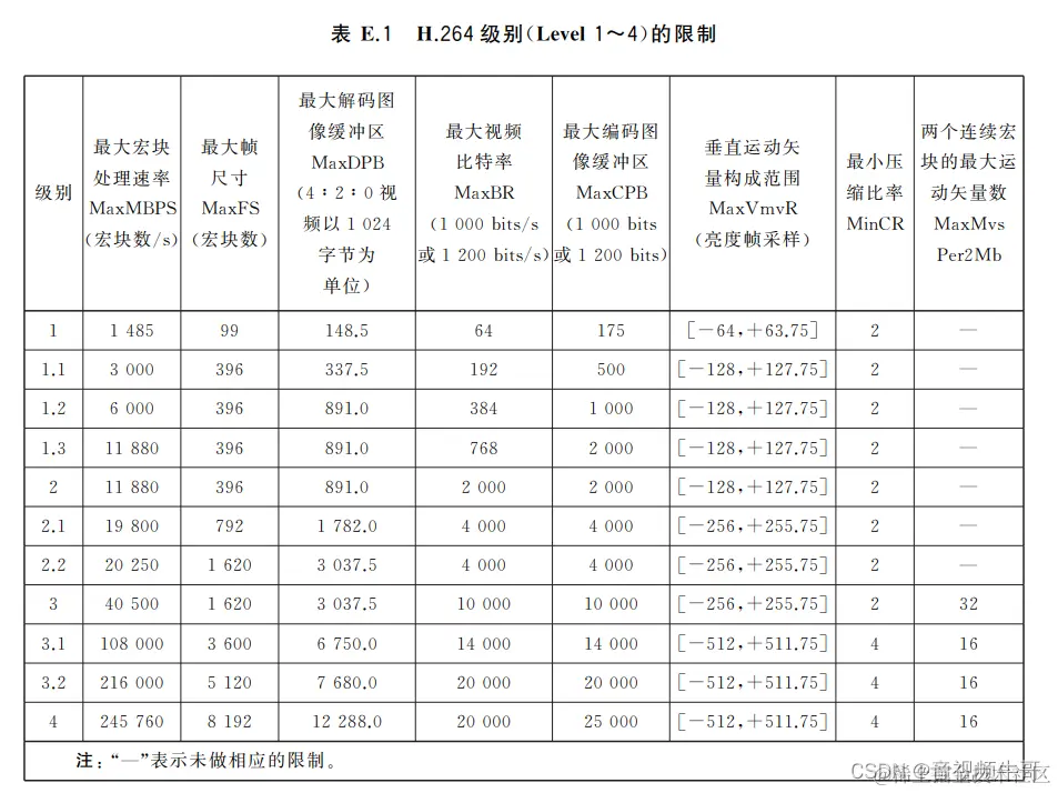 H.264级别(Level1~4)的限制如表 E.1所示,表中“—”表示未做相应的限制。
