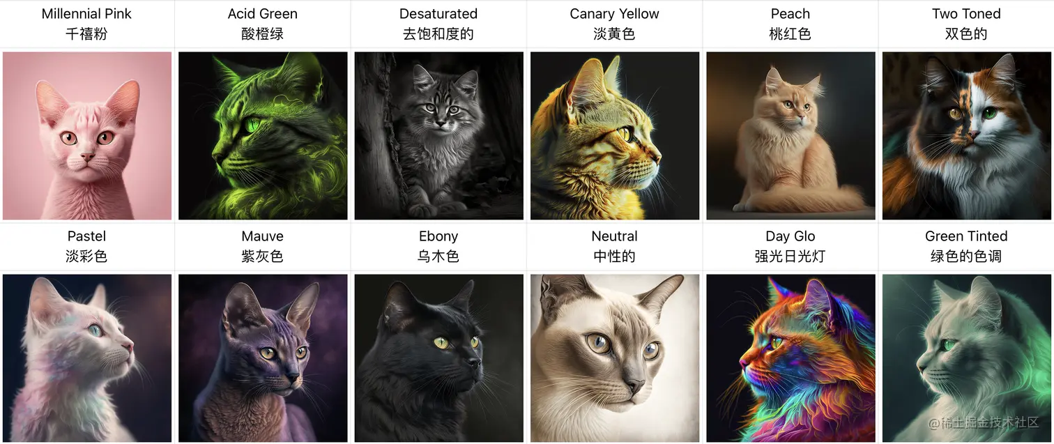 例如: /imagine prompt <color word> colored cat