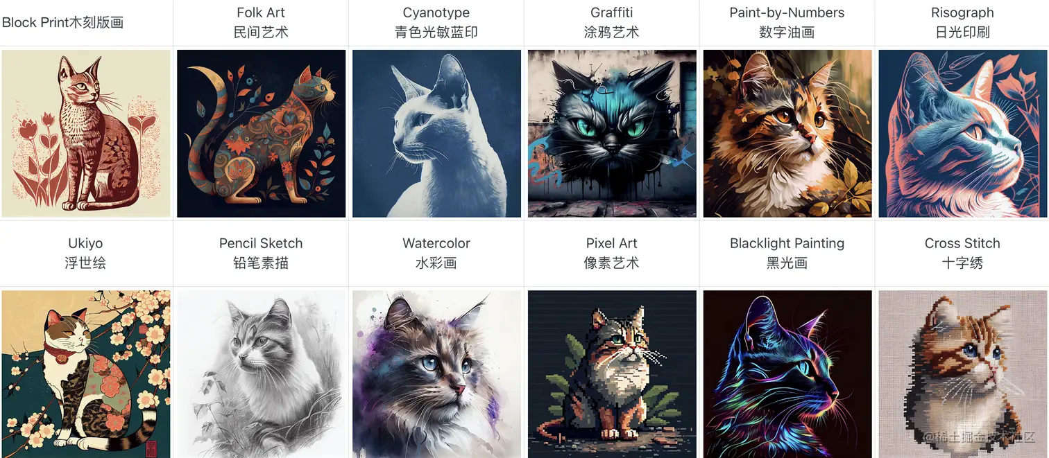 提示示例:/imagine prompt <any art style> style cat