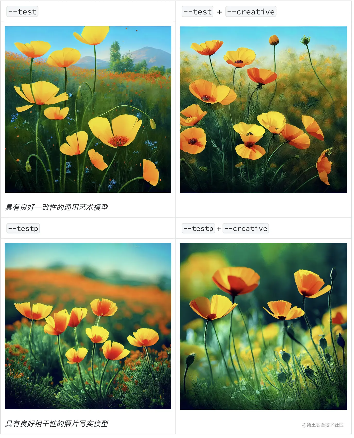 有时会发布新模型供社区测试和反馈,其中包括两个可用的测试模型:--test和--testp。这些模型可以与--creative参数一起使用,以获得更加多样化的构图效果。