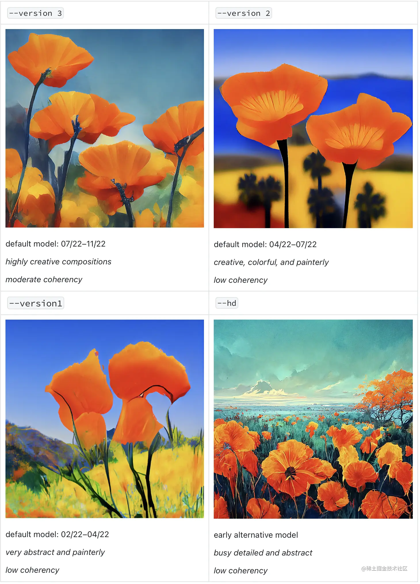 你可以通过使用--version或--v参数,或者使用/settings命令并选择模型版本来访问早期的Midjourney模型。不同的模型在不同类型的图像上有出色表现。 prompt 举栗: /imagine prompt vibrant California poppies --v 1