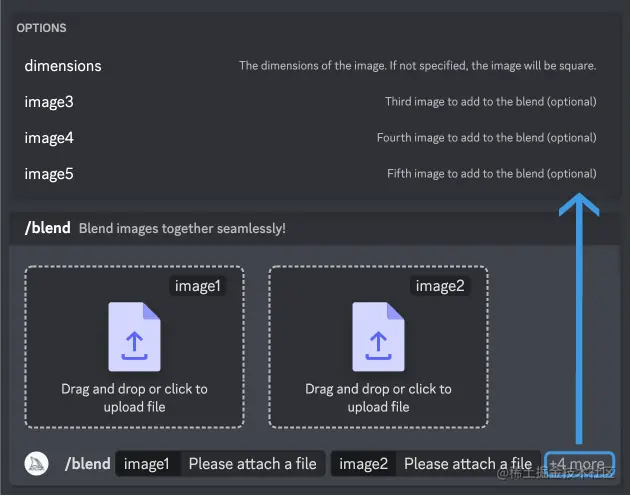 在输入 /blend 命令后,您将通过提示上传两张照片。从硬盘拖放图像或在使用移动设备时从照片库添加图像。要添加更多图像,请选择 optional/options 字段并选择 image3、image4 或 image5。相对于其他命令,/blend 命令启动可能需要更长时间,因为 Midjourney Bot 必须在上传图片后处理指令。