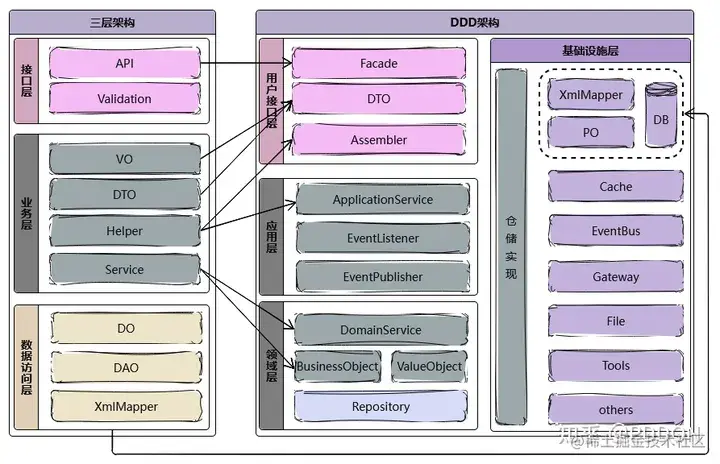 DD分层架构和三层架构的区别与关系DDD代码分层架构与传统三层架构对比,可以发现传统三层架构被看成是一个贫血模式的领域驱动设计