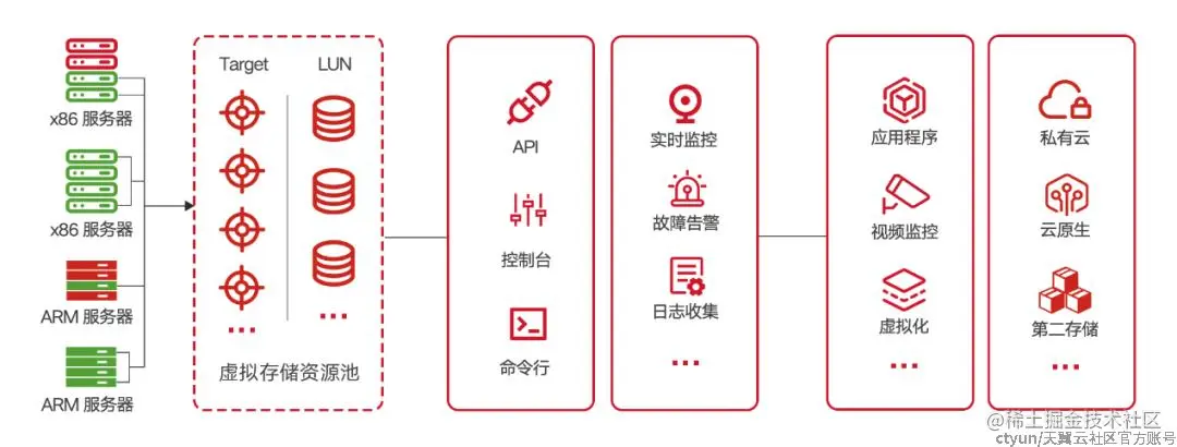 ▍采用分布式多控制器架构,实现多节点同时读写,避免单点性能瓶颈,具备集中式软件低时延特性,并且宏观上通过分布式提供扩展性,微观上每个卷具备多控能力以提高可用性;