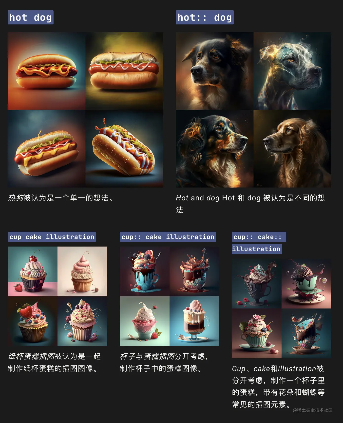 将双冒号::添加到提示中可以告诉Midjourney将每个部分单独考虑。例如,在以下提示hot dog中,所有单词都被视为一个整体,Midjourney会生成美味热狗的图像。但是如果将提示分成两个部分,hot :: dog,则机器人会将这两个概念单独考虑,创造一个热乎的狗。