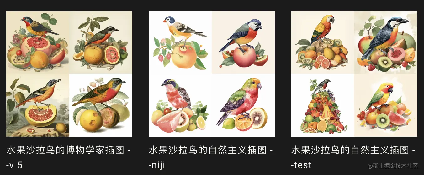 该提示将使用不同的 Midjourney模型版本 /imagine prompt a naturalist illustration of a fruit salad bird --{v 5, niji, test} 创建和处理三个作业: