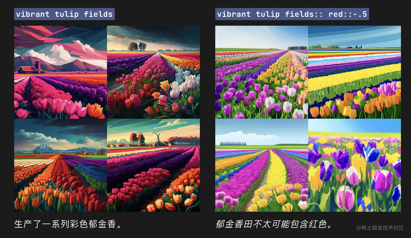 参数**--no** 与称重部分相同,多提示“-.5”与**vibrant tulip fields:: red::-.5相同vibrant tulip fields --no red**。