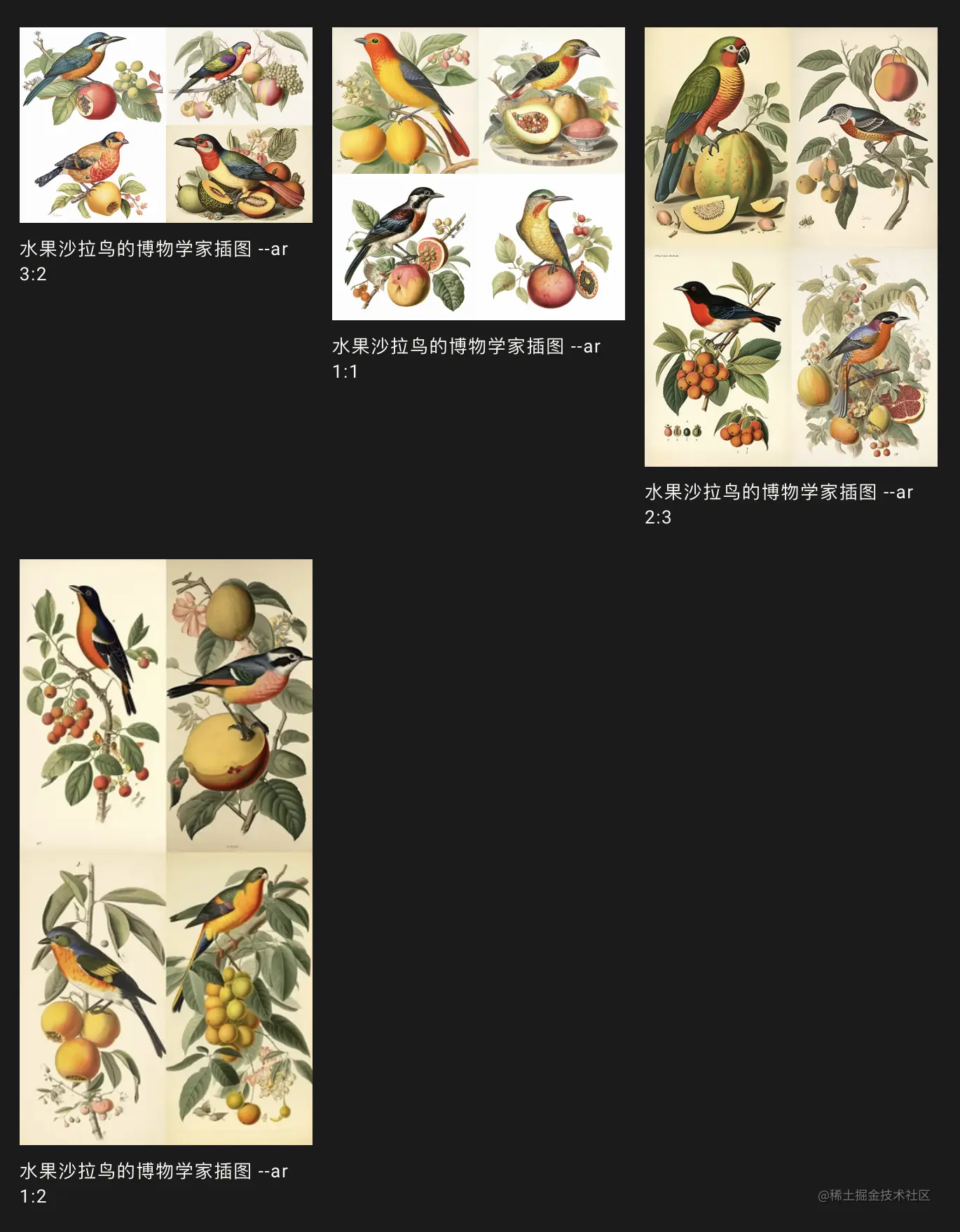 提示 /imagine prompt a naturalist illustration of a fruit salad bird --ar {3:2, 1:1, 2:3, 1:2} 将创建和处理四个具有不同纵横比的作业: