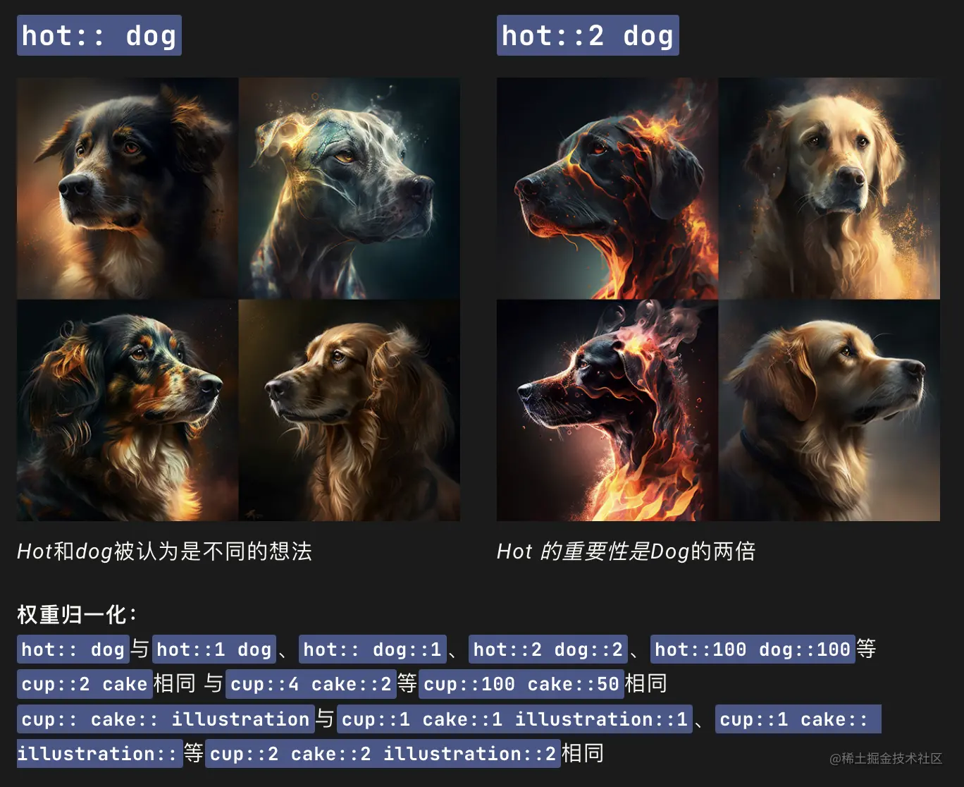 以下是一个例子:如果提示为 hot:: dog,则会产生一张被热气笼罩的狗的图片。但若更改为 hot::2 dog,这意味着单词hot比单词dog重要度高出两倍,因此将生成一张热冒火的狗。