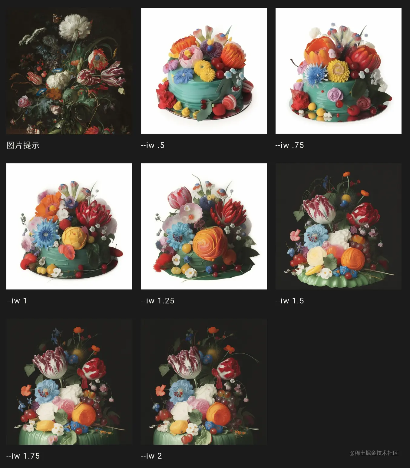 prompt example: /imagine prompt flowers.jpg birthday cake --iw .5 Image Prompt 参考图: