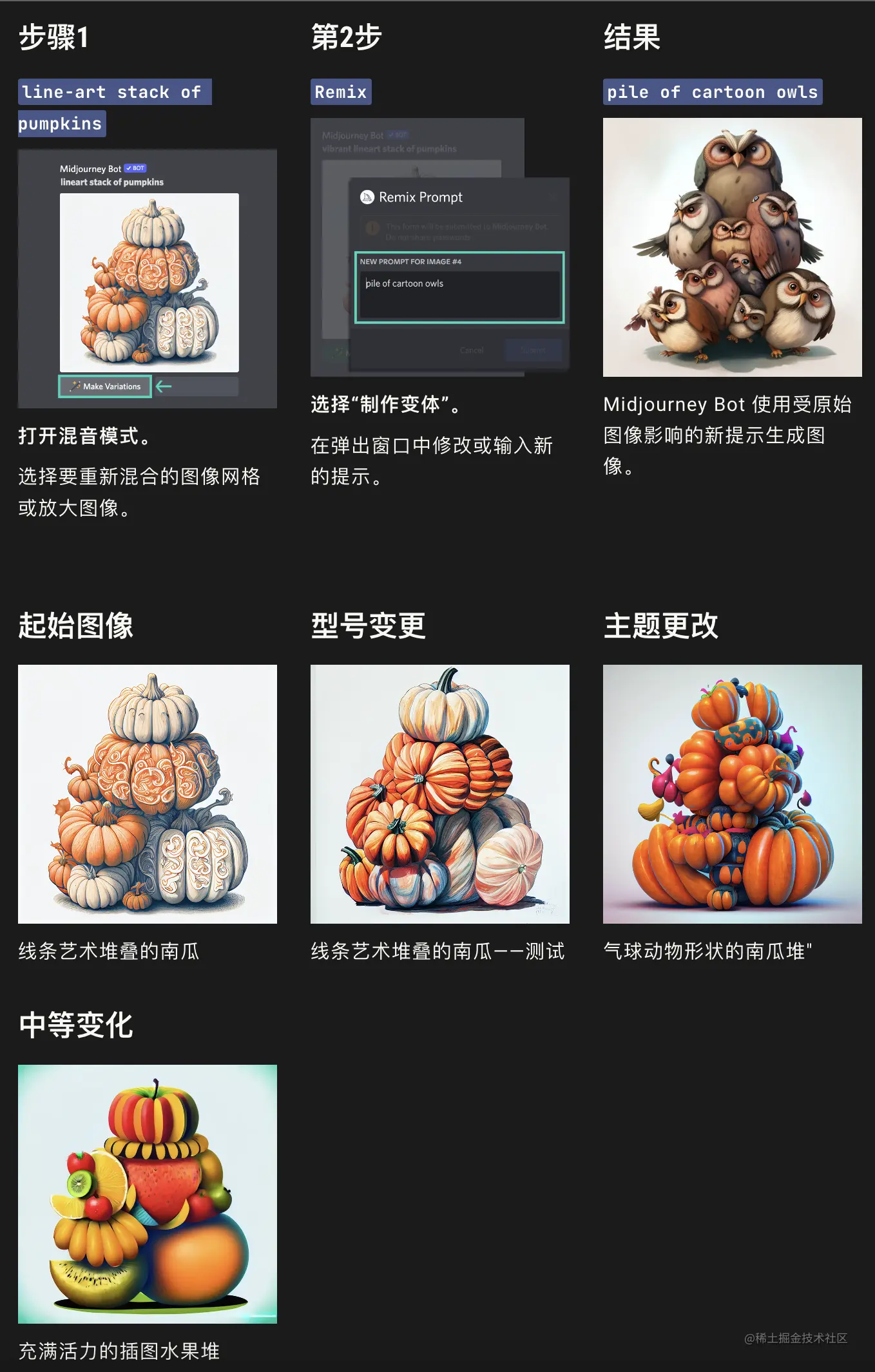 在使用Remix模式时,可以添加或删除参数,但必须使用有效的参数组合。比如:将 /imagine prompt illustrated stack of pumpkins --version 3 --stylize 10000 更改为 illustrated stack of pumpkins --version 4 --stylize 10000 会返回错误,因为Midjourney Model Version 4与Stylize参数不兼容。
