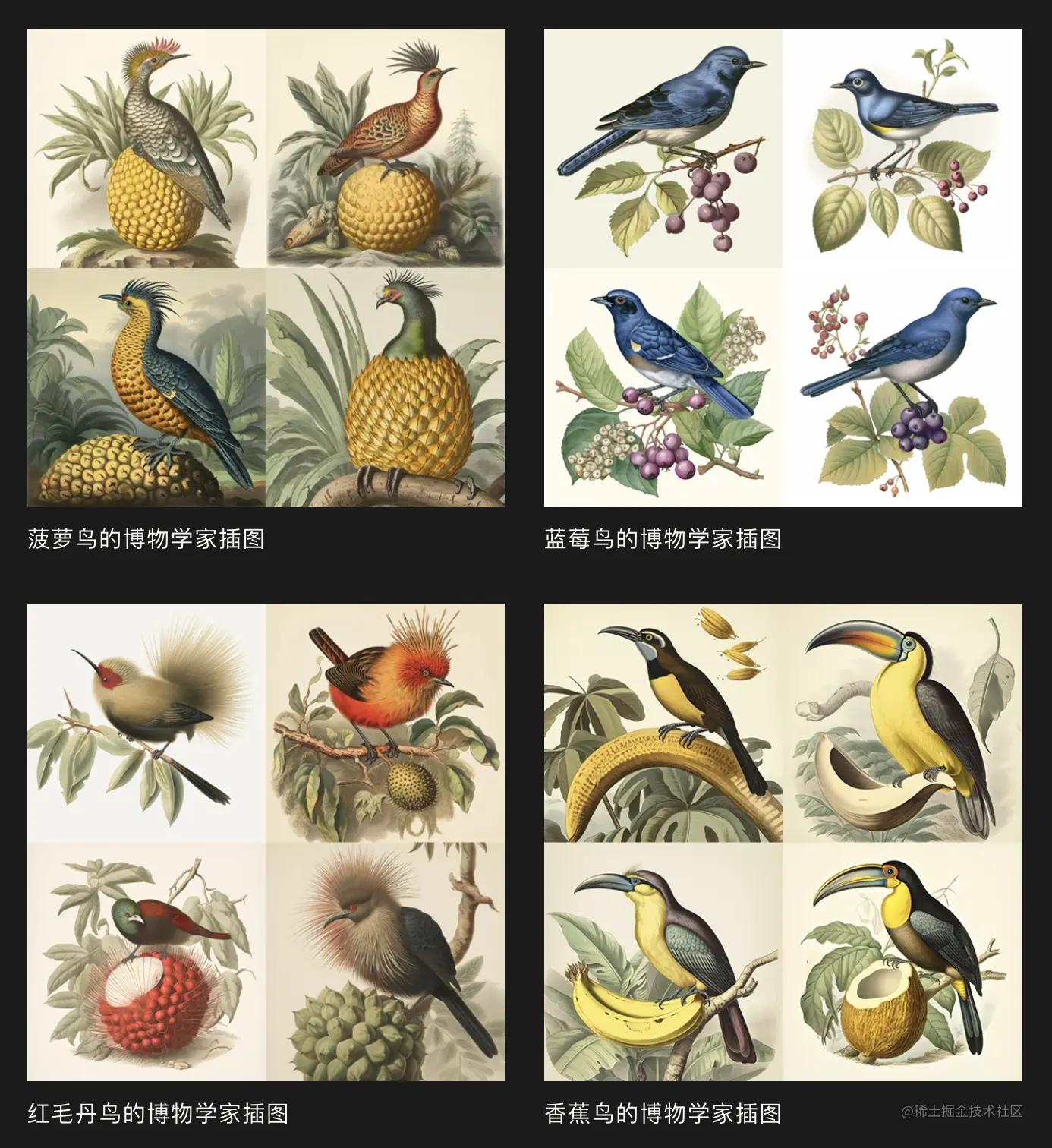 该提示 /imagine prompt **a naturalist illustration of a {pineapple, blueberry, rambutan, banana} bird**将创建并处理四个作业: