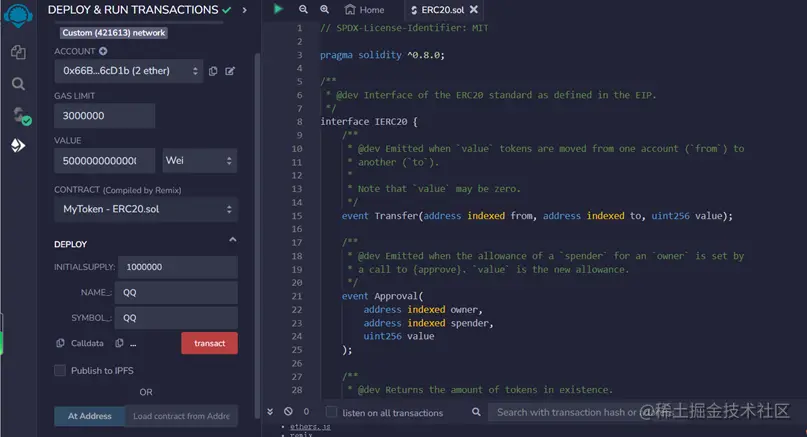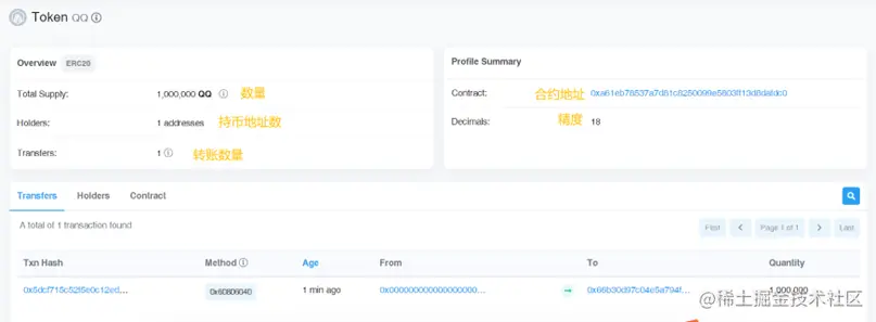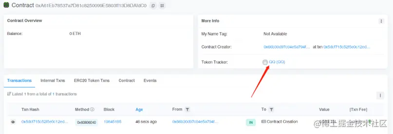 之后点击部署,支付 Gas 费,即可发布成功。以下是我填写的信息,大家可以看下,就是发行 100 万个 QQ 币