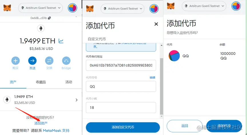 然后我们复制 QQ 币的合约地址,将其导入的钱包里:
