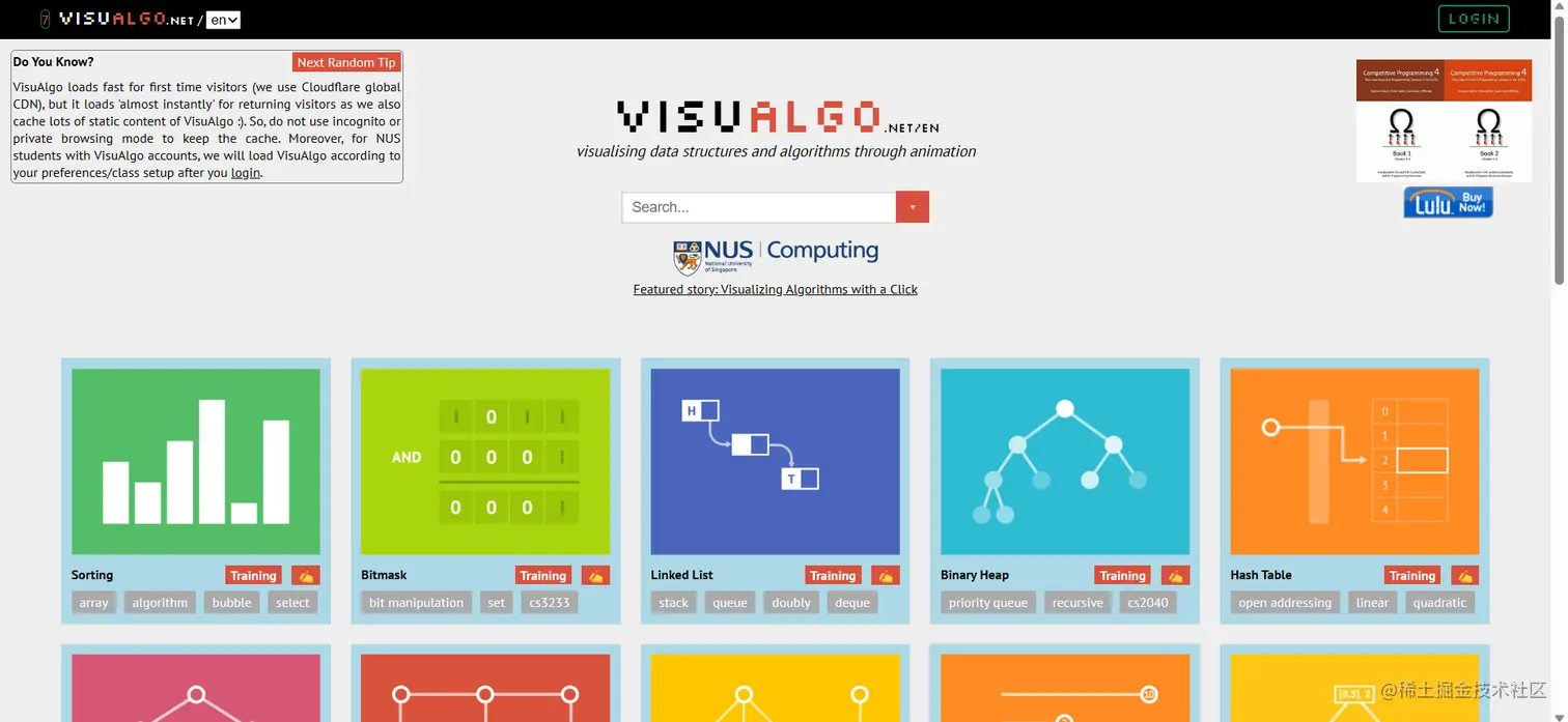 visualgo上采用可视化的图形展示了不同算法与数据结构,让你更好的理解各种概念,从而理解不同算法与数据结构的含义和用法。