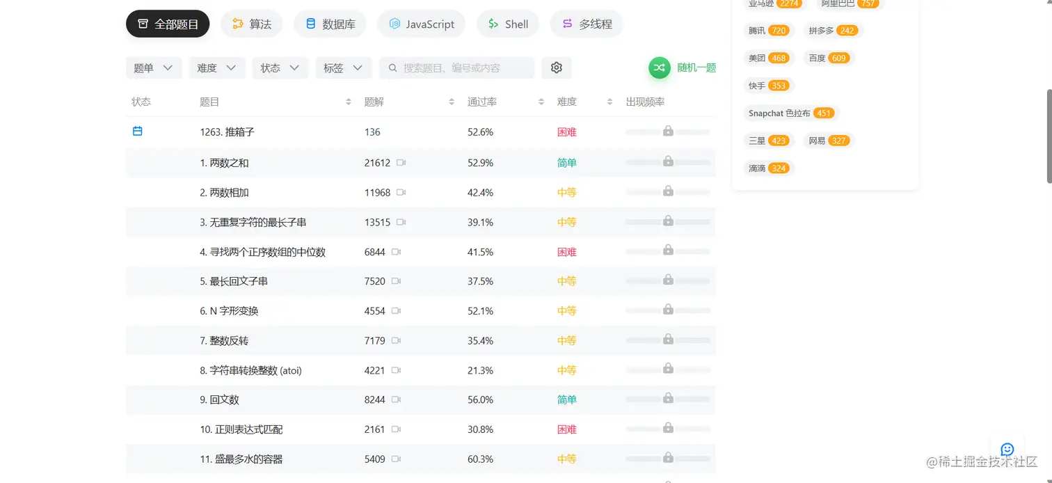程序员必备的网站之一,可以巩固算法与数据结构,大厂的面试中一般会出现2-3道算法题,只要做过基本就能bug free,拿下面试的第一关,可以说是跳槽面试中必备。