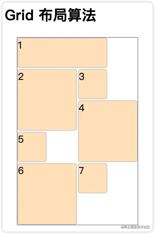 grid-auto-flow | 控制着自动布局算法怎样运作,精确指定在网格中被自动布局的元素怎样排列。 | row:指定自动布局算法按照通过逐行填充来排列元素,在必要时增加新行。 column:指定自动布局算法通过逐列填充来排列元素,在必要时增加新列。 dense:指定自动布局算法使用一种“稠密”堆积算法,如果后面出现了稍小的元素,则会试图去填充网格中前面留下的空白。这样做会填上稍大元素留下的空白,但同时也可能导致原来出现的次序被打乱。 row dense:行优先的“稠密”堆积算法。 column dense:列优先的行有限的“稠密”堆积算法。 |