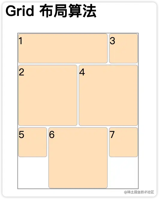 比如下面这个例子,第一个子节点占了三列,第二个子节点占了2列,那么第一行就会空一个。添加了grid-auto-flow: row dense后,就能自动匹配能填充到这个空间的子节点。(grid-auto-flow: dense也是同样的效果)