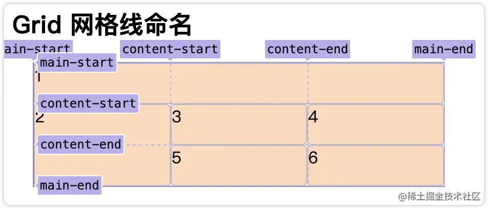 虽然我们可以通过指定网格线来确定网格区域,但是网格线还是太不直观了。接下来我们讲一讲怎么通过对网格线命名来解决这个问题。使用Chrome Dev Tools布局查看,可以看到命名的网格线名字。