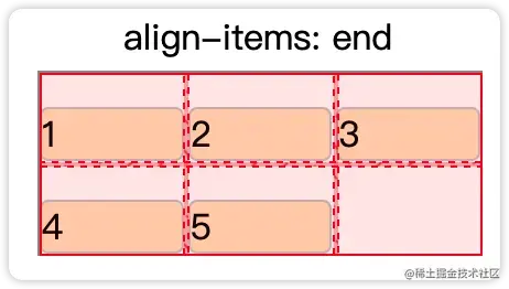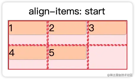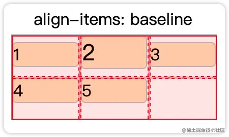 align-items | 水平方向(行维度)的子元素在自己空间的对齐 | start:对齐到最开始位置。 center:居中对齐 end:对齐到最末尾。 stretch:拉伸子元素到撑满整个容器 baseline:按照子元素的baseline对齐 |