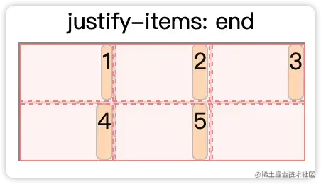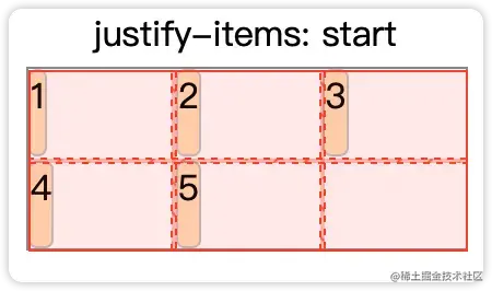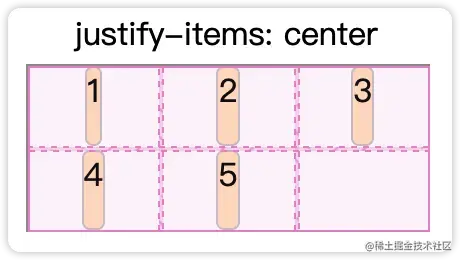 justify-items | 垂直方向(列维度)的子元素在自己空间的对齐 | start:对齐到最开始位置。 center:居中对齐 end:对齐到最末尾。 stretch:拉伸子元素到撑满整个容器 |