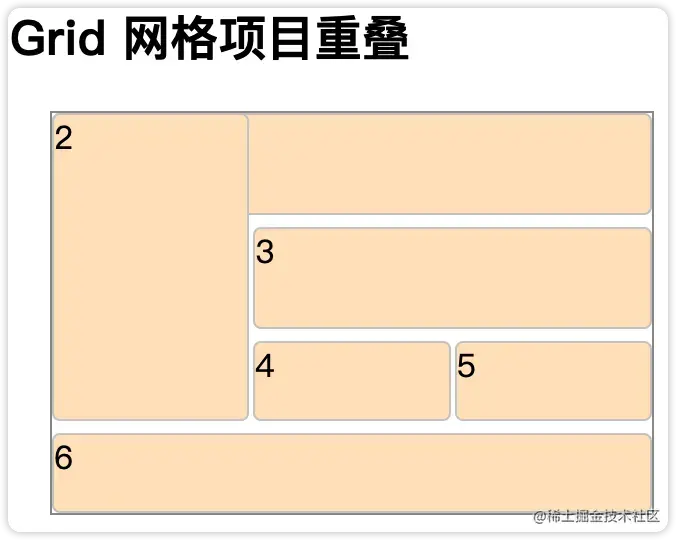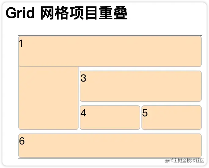 上面讲到,每一个网格项目都可以指定占据的网格单元。如果多个网格项目占据同一个网格单元呢。比如上面的例子,网格项目1和网格项目2都需要占据左上角这个网格单元。效果会是下面这样: