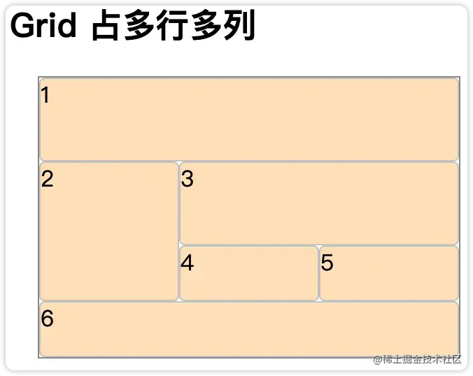 有了网格线,我们可以通过网格线指定跨轨道的网格元素,从而实现网格元素占多行多列的效果。子元素通过grid-column-start,grid-column-end,grid-row-start,grid-row-end或者grid-column和grid-row,或者通过grid-area这一个属性来设置来指定元素占据的网格轨道。