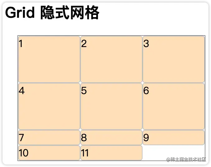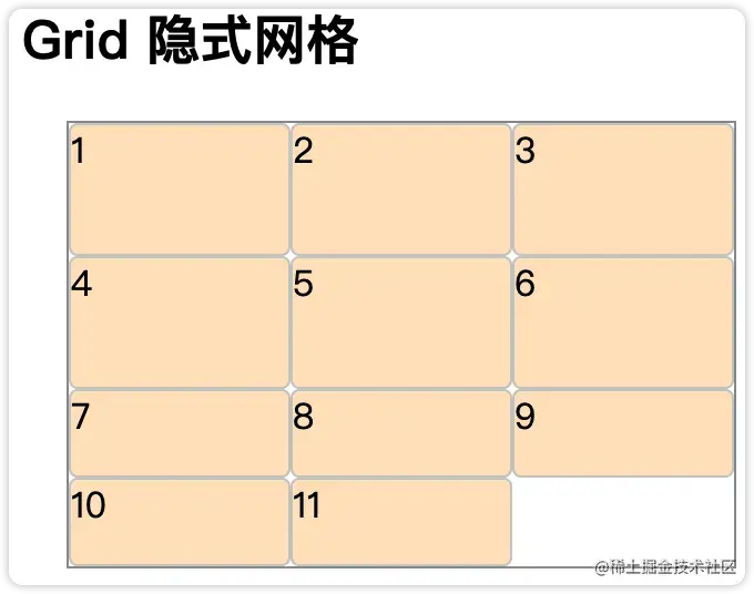 你也可以在隐式网格中用 grid-auto-rows 和 grid-auto-columns 属性来定义一个设置大小尺寸的轨道。 还是拿上面的例子,如果Grid的子节点大于6个,就会出现隐式网格。