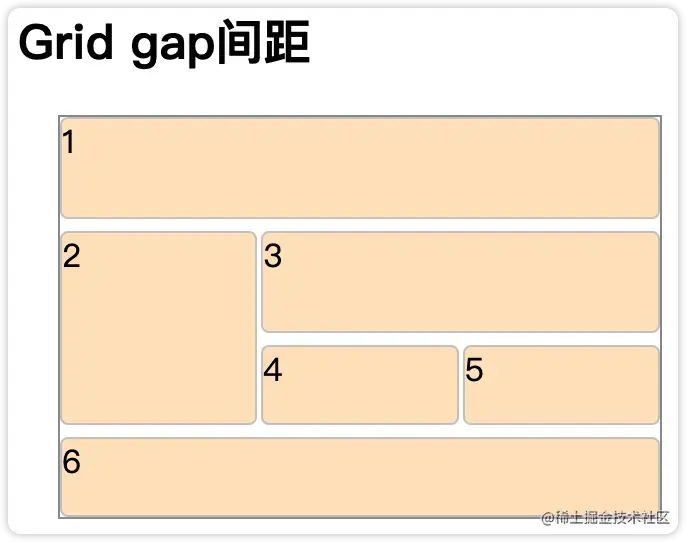 网格单元之间可以通过grid-column-gap,grid-row-gap或者grid-gap设置网格间距。下面的例子就是把网格列间距设置为2px,网格行间距设置为6px。