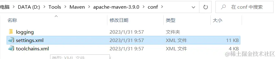 - 打开下载的 Maven,找到 conf 目录下的 settings.xml