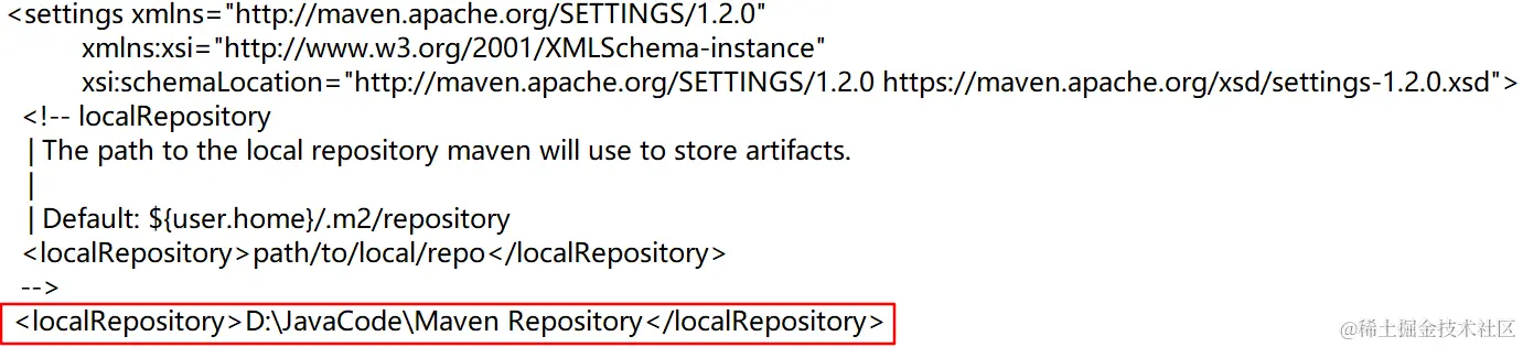 指定目录 D:\JavaCode\Maven Repository 作为本地仓库,用来存储 jar 包: