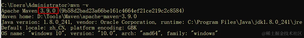 第三步:测试:按住 win+R 输入cmd,进入黑窗口控制台。输入命令: mvn -v 。如果出现以下 Maven 的版本信息,则说明 Maven 的安装与环境变量的配置均正确。