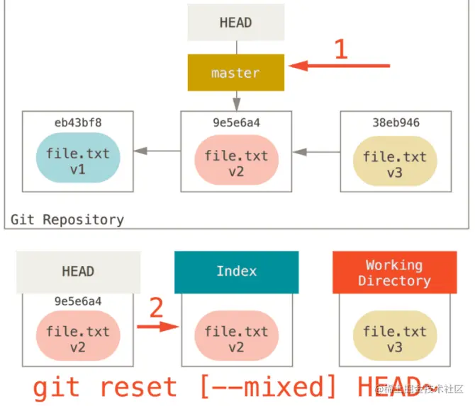 后面我们会讨论在仓库区发生的撤销行为,这里同样会有两个命令提供帮助,git reset